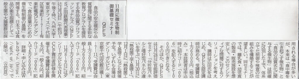 一般社団法人 食品品質プロフェッショナルズが開催するHACCP責任者研修が2024年10月21日の日本食糧新聞さまの紙面で紹介されました。ありがとうございます。